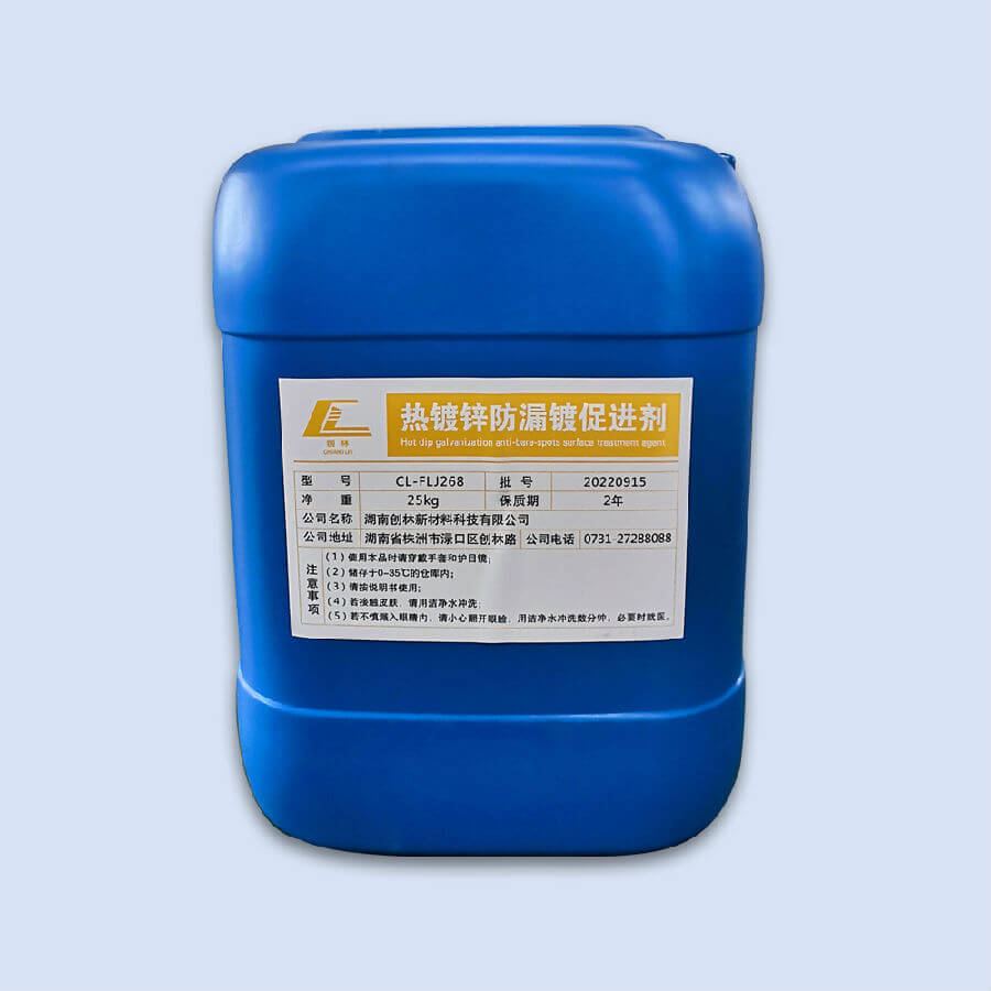 CL-FLJ268 hot dip galvanization anti-bare-spots surface treatment agent is a light blue aqueous solution, mainly composed of water-soluble organic chelating agents, surfactants, antioxidants, activators and metal organic compounds. This product does not contain lead, cadmium, mercury, hexavalent chromium, fluorine or phosphorus, and is an environmentally friendly product. Steel treated with this product and then processed with conventional zinc chloride-ammonium chloride flux can be galvanized in zinc solution with aluminum content ranging from 0.01% to 0.15% without any missed plating.